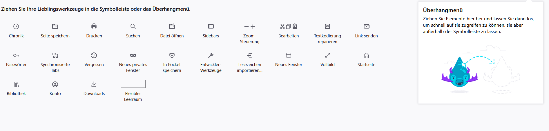 Na dann klicke mit der rechten Maustaste auf eine freie Stelle der Menüleiste oder Tableiste und wähle aus dem erscheinenden Kontextmenü den Eintrag Symbolleiste anpassen… aus. Auf der nun erscheinenden Seite hast du links einen Bereich mit vielen Symbolen. Darunter muss auch das Symbol „Bildschirmfoto“ sein. Ziehe es in die Symbolleiste. Wenn du das gemacht hast, klicke rechts unten auf die Schaltfläche Fertig, um das Fenster Symbolleiste anpassen… zu schließen.