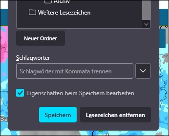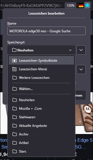 Wenn man wie ich häufig Lesezeichenordner zum Speichern wechselt, wäre es enorm hilfreich, wenn man gleich im drop-down-Menü nicht nur die letzten 7 angezeigt (von 'Neuheiten' an) bekäme, sondern z.B. deren 25. Also beim Anklicken des kleinen Pfeils meine ich.