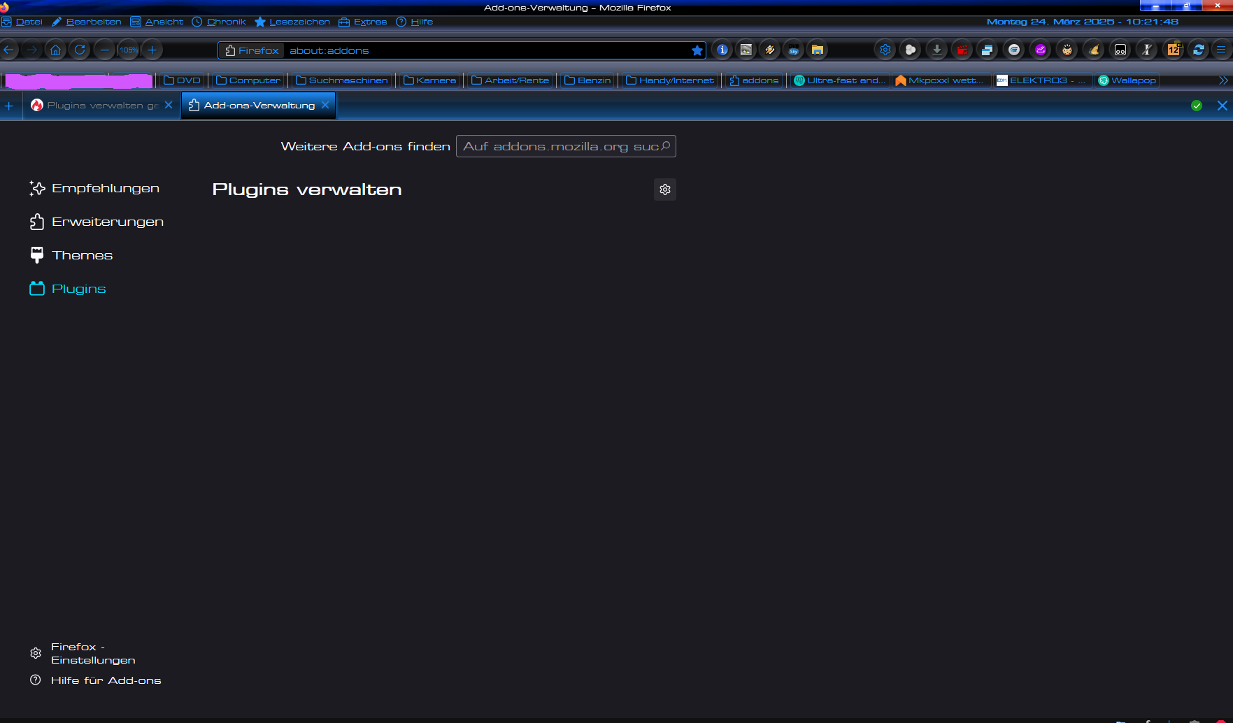 Wollte eigentlich kontrollieren, ob auch bei mir das Plugin OpenH264-Videocodec aktualisiert wurde nur wenn ich bei mir in about:addons auf "Plugins" drücke passiert nichts. Es werden keine Plugins angezeigt. Wenn ich die installierten Addons anzeigen lasse und danach auf "Plugins" drücke werden weiterhin die installierten Addons angezeigt.