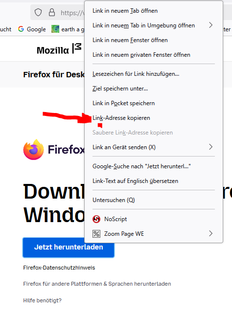 Wenn man mit der rechten Maustaste auf einen Link klickt, geht ein Menü auf. Hier kommt der Menüpunkt "Linkadresse kopieren". Mit dem Drücken der Taste "k" hat es den Link immer kopiert, das geht seit ein paar Wochen bei mir nicht mehr. Wenn ich mit der Maus auf die Zeile "Linkadresse kopieren" gehe und dann klicke, geht es, aber nicht mehr mit der Taste "k".