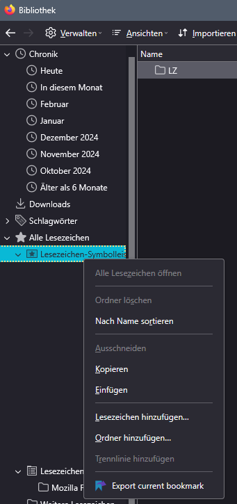 Mit dem vorherigen "Export Current Bookmark" habe ich diese Selektion nach Rechtsklick auf einen gewünschten Lesezeichen-Ordner unten bekommen und konnte diesen Ordner exportieren.