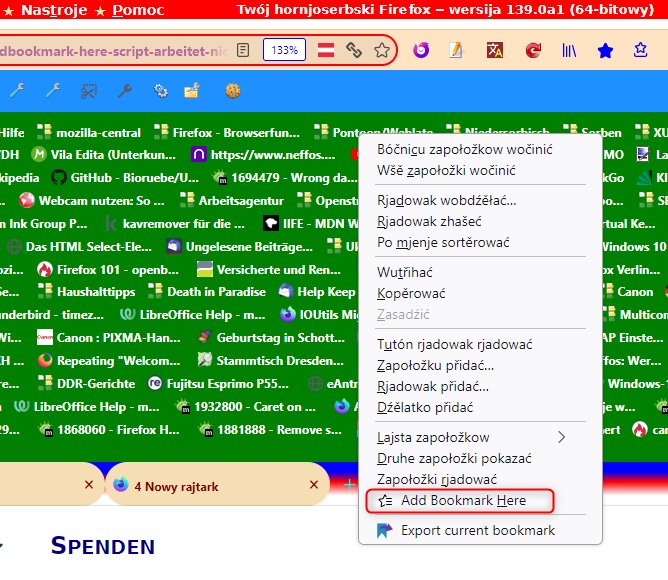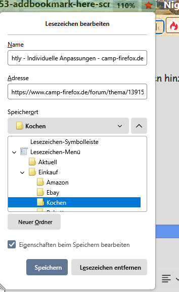 Nachfolgendes Script funktioniert schon länger nicht mehr. Ein mit STRG D gespeichertes Lesezeichen kann ich zwar im Auswahlmenü einem Ordner zielgerichtet zuordnen. Abgelegt wird es aber im Lesezeichenmenü am Ende. Kann man das Script heilen?