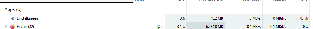 Bei diesem Beitrag geht es nicht um ein Problem, der Firefox-Browser funktioniert einwandfrei. Deshalb habe ich es in der Rubrik Small-Talk eröffnet. Im Windows Taskmanager werden mir um die 80 Firefox-Prozesse angezeigt mit einer Speicherbelegung um die 7 GB und 20 geöffneten Tabs. Um Erweiterungen auszuschliesen habe ich Firefox im abgesicherten Modus gestartet. Als Antivirus-Software ist der Windows Defender installiert. Ist die Anzahl der Prozesse normal? Oder sollte ich ein neues Profil inkl. Neuinstallation von Firefox ausführen? Der Speicher des Computer ist zu 16% ausgelastet.