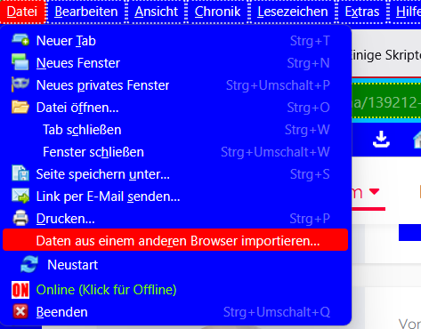 Alles anzeigen// RestartFirefox_plus.uc.js 2 (function() { if (location != 'chrome://browser/content/browser.xhtml') return; try { CustomizableUI.createWidget({ id: 'restart-button', type: 'custom', defaultArea: CustomizableUI.AREA_NAVBAR, onBuild: function(aDocument) { var toolbaritem = aDocument.createElementNS('http://www.mozilla.org/keymaster/gatekeeper/there.is.only.xul', 'toolbarbutton'); let props = { id: 'restart-button', class: 'toolbarbutton-1 chromeclass-toolbar-additional', removable: false, label: 'Neustart', tooltiptext: 'Links-Klick für Neustart\nRechts-Klick oder Rad-Klick für Neustart mit userChrome.js-Cache leeren', style: 'list-style-image: url(file:///C:/Users/Ramo/AppData/Roaming/Mozilla/Firefox/Profiles/c612nnc8.default-release/chrome/Icons/restartButton.png)', }; for (var p in props) toolbaritem.setAttribute(p, props[p]); toolbaritem.addEventListener('click', event => { if (event.button == 1) { Services.startup.quit(Ci.nsIAppStartup.eRestart | Ci.nsIAppStartup.eAttemptQuit); } if (event.button == 0 || event.button == 2) { event.preventDefault(); Services.appinfo.invalidateCachesOnRestart(); Services.startup.quit(Ci.nsIAppStartup.eRestart | Ci.nsIAppStartup.eAttemptQuit); } }); return toolbaritem; } }); } catch(e) { }; var menuitem = document.createXULElement('toolbarbutton'); menuitem.id = 'restartfirefox-fileMenu'; menuitem.classList.add('subviewbutton', 'subviewbutton-iconic'); menuitem.setAttribute('label' , 'Neustart'); menuitem.setAttribute('tooltiptext' , 'Neustart'); menuitem.style.listStyleImage= 'url(file:///C:/Users/Ramo/AppData/Roaming/Mozilla/Firefox/Profiles/c612nnc8.default-release/chrome/Icons/restartButton.png)'; menuitem.addEventListener('click', event => { if (event.button == 1) { Services.startup.quit(Ci.nsIAppStartup.eRestart | Ci.nsIAppStartup.eAttemptQuit); } if (event.button == 0 || event.button == 2) { Services.appinfo.invalidateCachesOnRestart(); Services.startup.quit(Ci.nsIAppStartup.eRestart | Ci.nsIAppStartup.eAttemptQuit); } }); var refItem = document.getElementById('goOfflineMenuitem'); refItem.parentNode.insertBefore(menuitem, refItem); var menuitem = document.createXULElement('toolbarbutton'); menuitem.id = 'restartfirefox-appMenu'; menuitem.classList.add('subviewbutton', 'subviewbutton-iconic'); menuitem.setAttribute('label' , 'Neustart'); menuitem.setAttribute('tooltiptext' , 'Neustart'); menuitem.style.listStyleImage= 'url(file:///C:/Users/Ramo/AppData/Roaming/Mozilla/Firefox/Profiles/c612nnc8.default-release/chrome/Icons/restartButton.png)'; menuitem.addEventListener('click', event => { if (event.button == 0) { Services.startup.quit(Ci.nsIAppStartup.eRestart | Ci.nsIAppStartup.eAttemptQuit); } if (event.button == 1 || event.button == 2) { Services.appinfo.invalidateCachesOnRestart(); Services.startup.quit(Ci.nsIAppStartup.eRestart | Ci.nsIAppStartup.eAttemptQuit); } }); var refItem = document.getElementById('appMenu-viewCache').content.getElementById('appMenu-quit-button2'); refItem.parentNode.insertBefore(menuitem, refItem); })();Geht wahrscheinlich auch einfacher und besser zu machen.