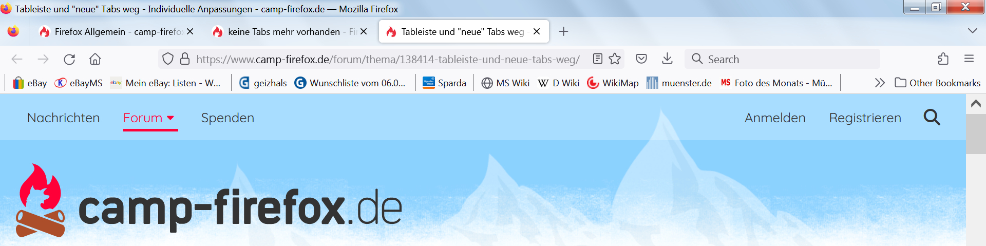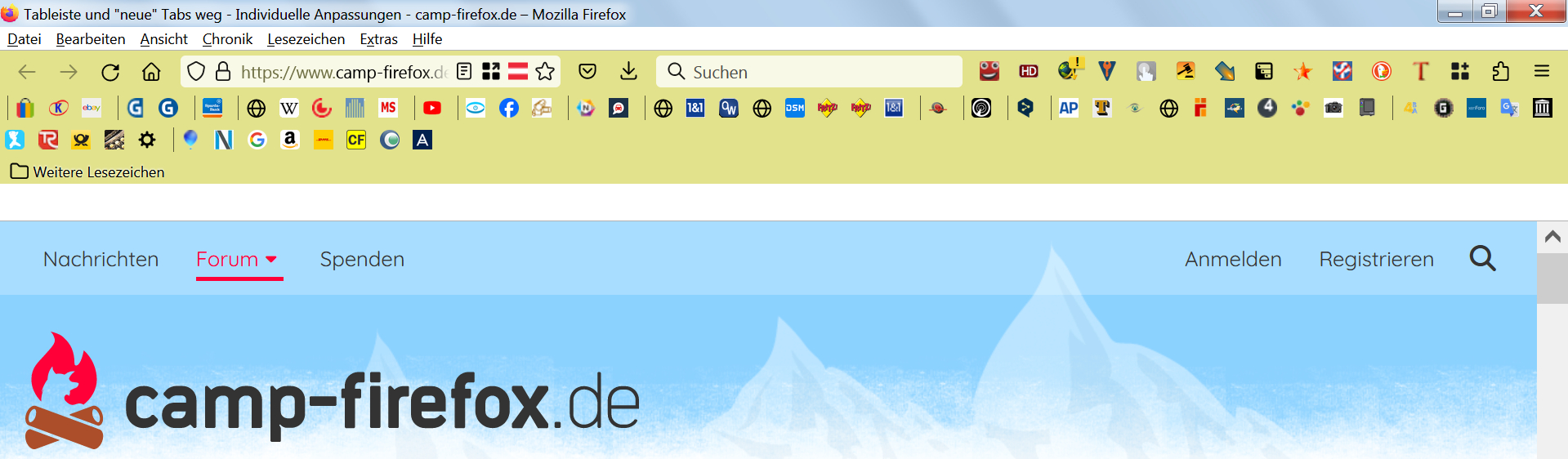 Seit einem update, vor einiger Zeit, werden geöffnete Tabs nicht mehr angezeigt. Ich muss den Mauszeiger auf das Firefox-Icon in der Taskleiste führen, dann erst werden dort die geöffneten Tabs als Miniaturbild angezeigt. Im Browser selbst erscheinen keine Tabs und keine Tabsleiste mehr.