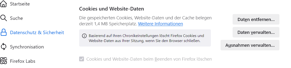 Ich möchte verhindern, dass Cookies von einer bestimmten Website (Steuerung eines Video-Recorders) gelöscht werden. Bisher funktionierte dies über "Einstellungen / Datenschutz und Sicherheit / Cookies und Websitedaten / Ausnahmen verwalten". Nun erhalte ich die Warnung: "Basierend auf Ihren Chronikeinstellungen löscht Firefox Cookies und Websitedaten Ihrer Sitzung, wenn Sie den Browser schließen." Genau das möchte ich nicht, finde aber in den Chronikeinstellungen keine bezughabenden Möglichkeit.