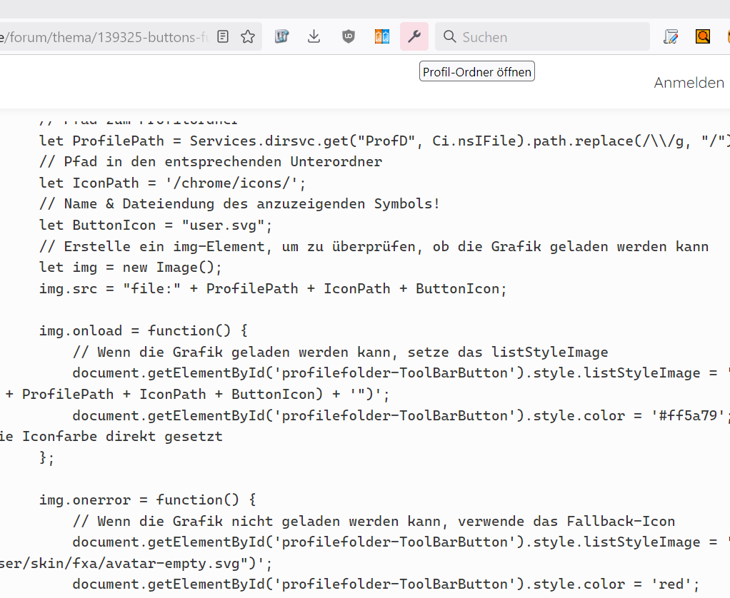 Oder mal in der userChrome.css #profilefolder-ToolBarButton {fill: red !important;} probieren, oder sowas in der Art.
