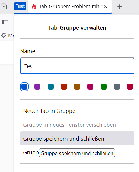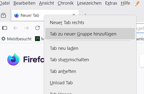 Das funktioniert leider nur dann, wenn diese Gruppe geöffnet ist. Solange die Gruppe nicht geöffnet ist, wird mir per Rechtsklick auf den hinzuzufügenden Tab lediglich "Zu neuer Gruppe hinzufügen" angebeoten. Die zuvor von mir erstellte Gruppe wird dort nicht zur Auswahl angeboten.