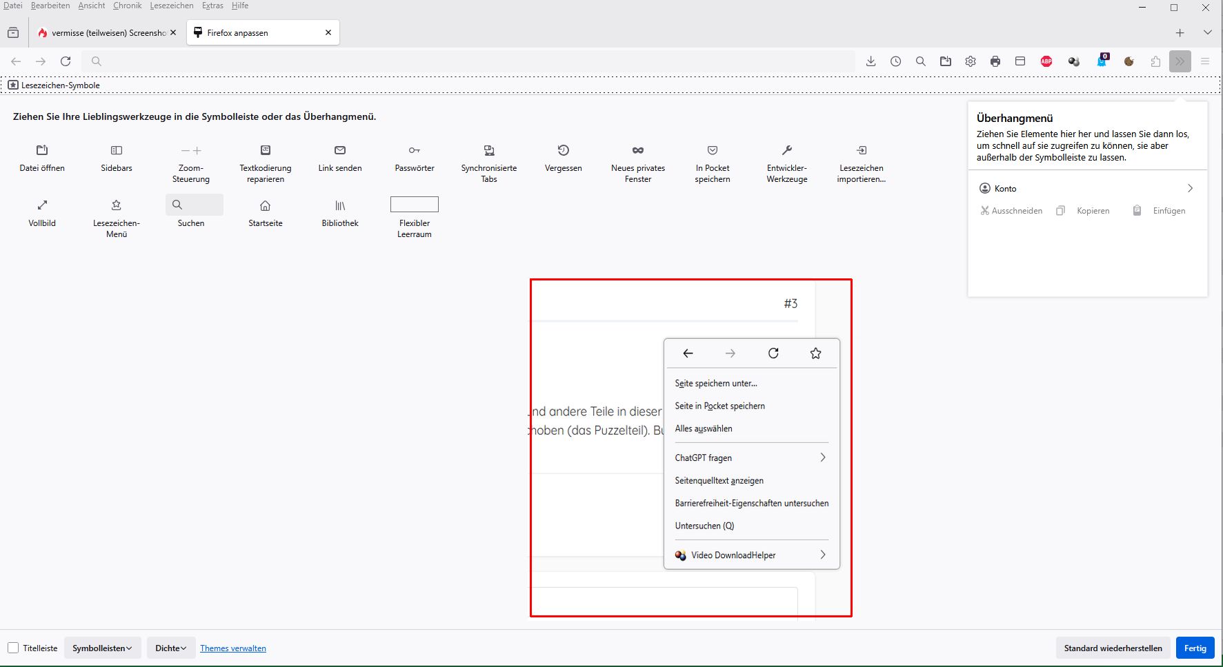 ich weiß nicht, was du mit einem „teilweisen“ Screenshot meinst. Aber die Screenshot-Funktion erreichst du, indem du irgendwo auf einer Website einen Rechtsklick machst und „Bildschirmfoto aufnehmen“ auswählst. Ansonsten kannst du über Menü → Weitere Werkzeuge → Symbolleiste anpassen … die Schaltfläche „Bildschirmfoto“ in die Oberfläche ziehen.