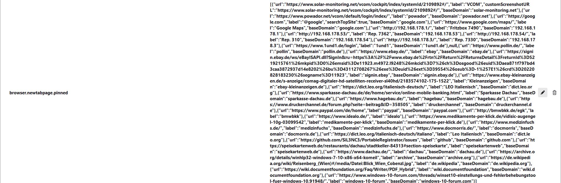 Dann hast du den Eintrag selbst (vielleicht versehentlich) als Boolean angelegt. Klicke auf das Mülleimer-Symbol neben der Einstellung. Gib erneut browser.newtabpage.pinned in das Filterfeld ein und stelle dann sicher, dass „String” anstelle von „Boolean“ ausgewählt ist, bevor du das Plus-Symbol klickst. Danach kannst du den Inhalt als Text bearbeiten.