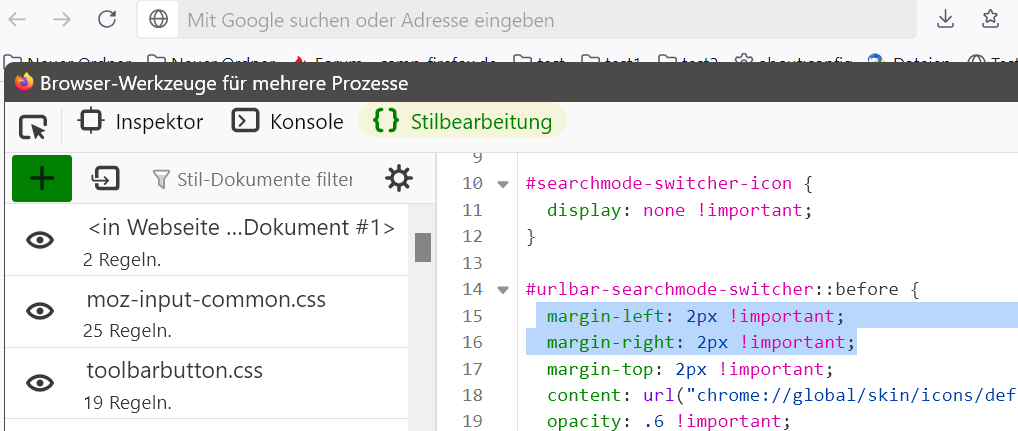 Da das hier das einzige Thema im Forum zu sein scheint, in dem dieses Element vorkommt, erwähne ich es hier: #searchmode-switcher-icon ist ab Firefox 143 .searchmode-switcher-icon.