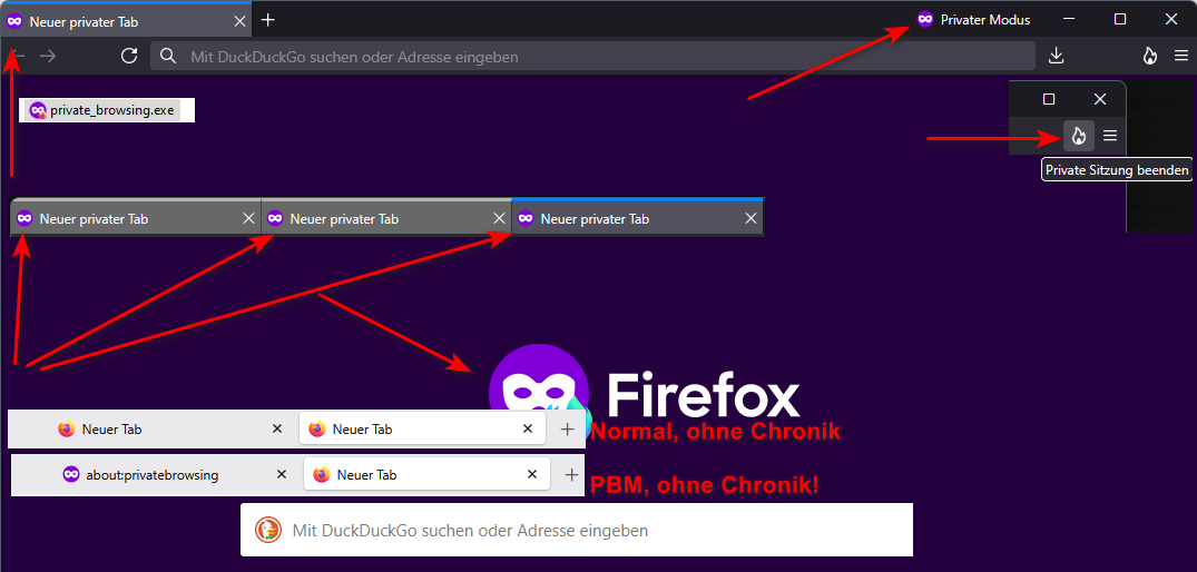 - bestehende Fenster zu schließen und über den ShortCut für privaten FF gezielt ein privates Fenster (als einziges dann offenes Fenster) neu zu öffnen, oder