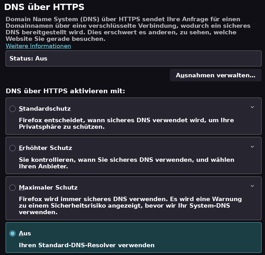 • Wenn du im Firefox nicht DNS über HTTPS aktiviert hast, dann solltest du auf jeden Fall mal prüfen welcher DNS-Server in der Fritzbox eingestellt ist. Falls du dort einen individuellen DNS-Server mit DNS over TLS (DoT) nutzt, dann die Funktion "DNS over TLS (DoT)" mal deaktiveren und den DNS-Server vom Anbieter testen.