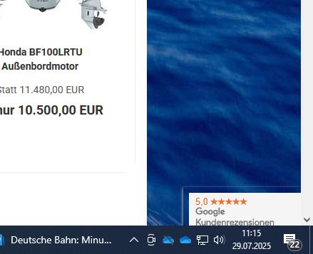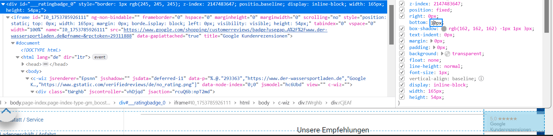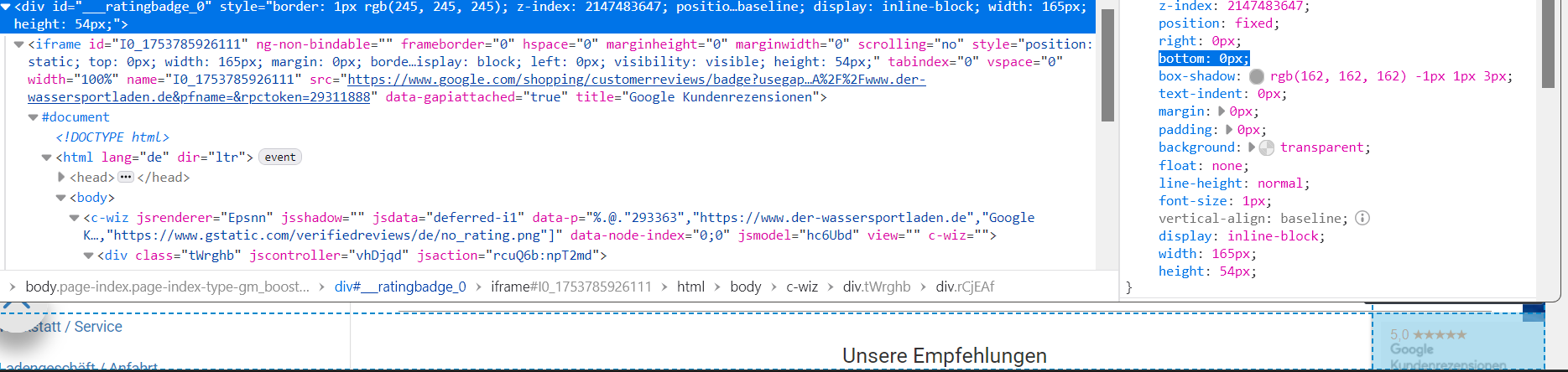 Schon seit ein paar Jahren beobachte ich das Problem, dass das Google Kundenrezensionen Badge in allen mir bekannten Webshops von Firefox abgeschnitten dargestellt wird. Damals ging ich davon aus, dass das Problem in Firefox irgendwann behoben wird, was aber bis heute nicht erfolgt ist. Mit verschiedenen Korrekturversuchen im eigenen Webshop kam ich bisher nicht weiter. Bei anderen mir bekannten Webseiten wurde das Badge mittlerweile entfernt.