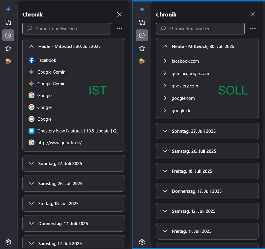 Mit dem Update auf diese neue Oberfläche mit den abgerundeten Kästen (kam wohl mit 141.0) merkt sich Firefox nicht mehr die Einstellung für die Sortierung der Chronik. Nach jedem Start von FF ist diese wieder auf "Datum" statt dem von mir umgestellten "Datum und Webseite". Wir haben jetzt schon die prefs.js vor und nach dem Umstellen verglichen - auch habe ich about:config nach möglichen Schlüsseln zuvor durchsucht gehabt. Mich nervt es einfach, immer über die 3 Punkte das Ganze wieder neu gruppieren zu müssen.