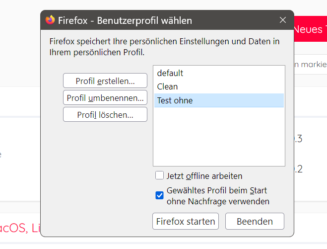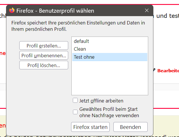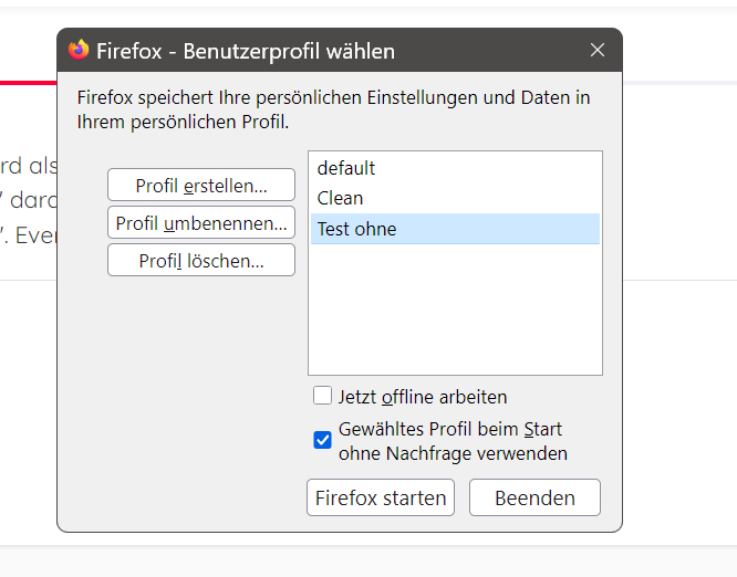 Aber auch dann wird wieder das Standard Profil (Test-Ohne) geöffnet![]()