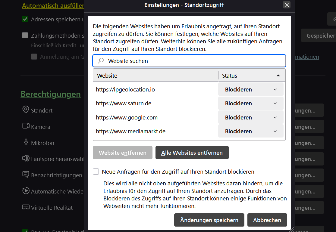 Für die Webseiten sind die Standort-Zugriffe erlaubt.