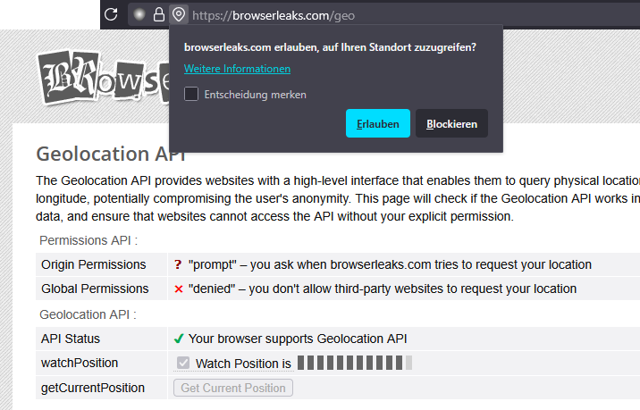 Unter Windows verwendet Firefox das moderne Windows.Devices.GeolocationAPI für Geolokalisierung anstelle der Windows 7 Standort-API.Nun funktioniert auch die Standort-Ermittlung korrekt.