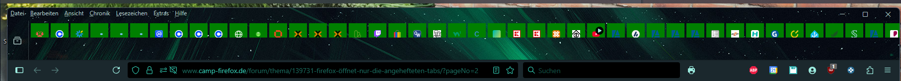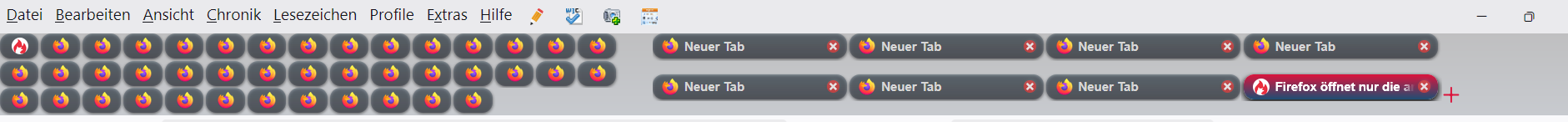 Um das für mich zu rekapitulieren: Ich müsste eine stattliche Anzahl Tabs anpinnen neben den normalen, und dann Firefox neu starten? Seit 12 Versionen unerkannt, so ein Fehler? Echt schräg.