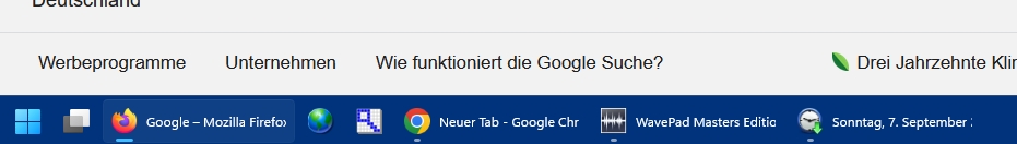 Die Startleistenschaltfläche von Firefox überlagert eines meiner Schnellstart-Symbole in der Task-Leiste beim Aufruf von Firefox . Alle anderen Programme, die ich ausprobiert habe, tun dieses nicht. Sie setzen sich in der Taskleiste ganz rechts neben die Startleistenschaltflächen anderer Programme. Firefox jedoch setzt sich ganz links neben die beiden systemeigenen Symbole von Windows. Eine Besonderheit des Startleistensymbols, welches dadurch überlagert wird, ist, dass es ein Programmaufruf mit einer Option ist. Da dies, wie gesagt, bei anderen Programmen nicht so ist, gehe ich davon aus, dass es irgendeine Einstellung bei Firefox geben könnte, die dieses Verhalten forciert. Woran könnte es also liegen? Ich habe versucht, in dem beiliegenden Bildschirmfotos den Fakt zu illustrieren.