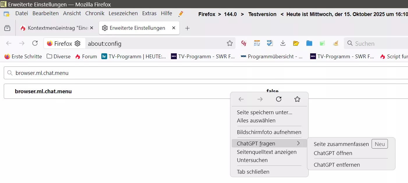 lenny2 schrieb am Mi. hier das der Eintrag noch sichtbar ist. Da war doch aber schon Version 144 draußen, oder? Und Mittwoch Nachmittag schreibt Mitleser hier über einen Eintrag in "about:config".