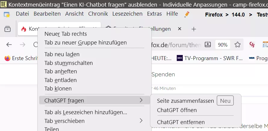 V144.0, es hat funktioniert, Seiten-Kontext und Tab-Kontext
