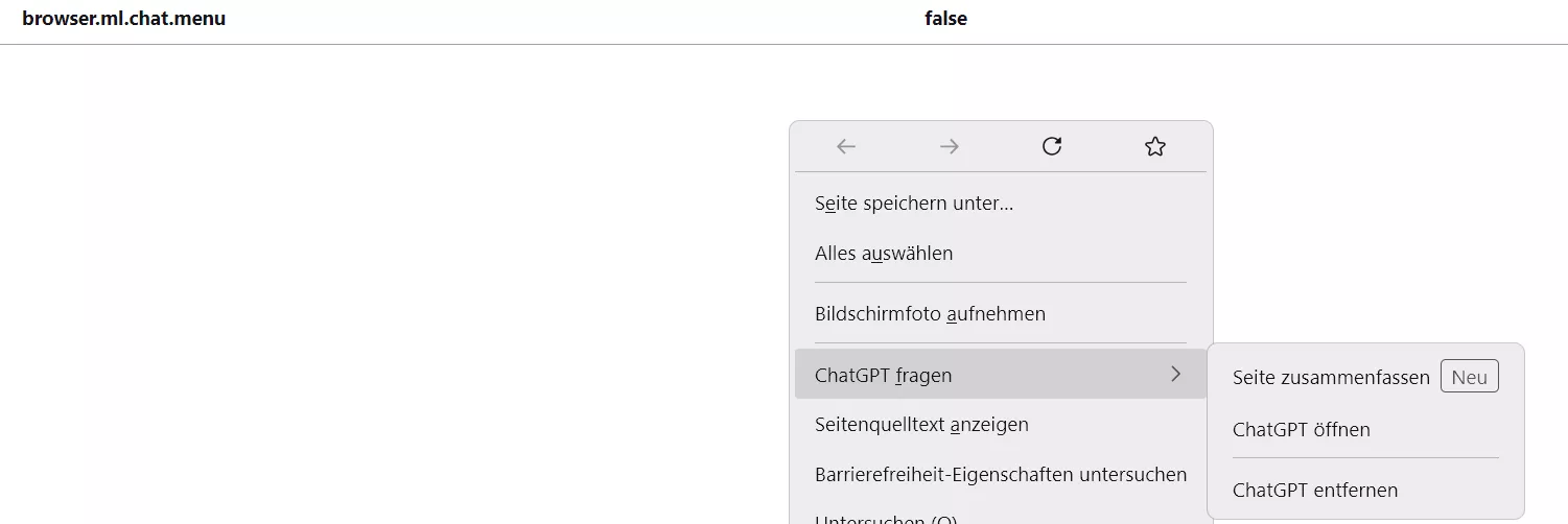 Ich habe gerade in einem Testprofil das Update gemacht und da kann ich das ganz ohne *.css ausblenden. Grundsätzlich ist es ja schön wenn verschiedene Stellschrauben zum gleichen Ergebnis führen, aber wenn ICH einen Eintrag mit minimalem Aufwand (in diesem Fall direkt via Kontext-Menü "KI-Chatbot entfernen") wegbekomme, tu' ich mir doch nicht den Mehraufwand an und nehme Umwege in Kauf. Bei einem *.css Eintrag muss ich das um mich zu erinnern dokumentieren und auch bei about:config-Einträgen sollte man das nachhalten.