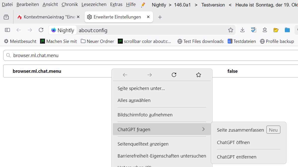 1995119 - "Ask an AI Chatbot" context menu is not hidden, even if Machie Learning is disabledUNCONFIRMED (nobody) in Core - Machine Learning. Last updated 2025-10-18.bugzilla.mozilla.org1994785 - AI Context Menu is still displayed if browser.ml.chat.enabled is set to falseNEW (nobody) in Core - Machine Learning. Last updated 2025-10-17.bugzilla.mozilla.orgZitatYep, I was just about to report this issue myself as well. Interestingly, this bug is only impacting one of my profiles - my others (which also have browser.ml.chat.enabled set to false) don't seem to be impacted.