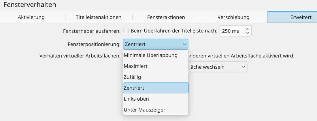 • Ob die Funktion zur Positionierung der Fenster überhaupt vorhanden ist hängt wohl auch von der verwendeten Desktopumgebung ab wie KDE, Gnome usw.
