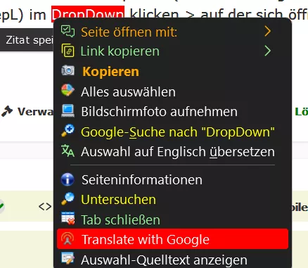 Markieren des zu übersetzenden Texts > Rechtsklick auf diesen Text > Kopieren (die Markierung bleibt bestehen) > nochmal Rechtsklick auf den Text > auf Übersetzen (DeepL) im DropDown klicken > auf der sich öffnenden DeepL-Seite: Einfügen. Voilá.