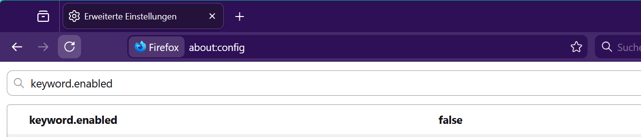 Ich habe die Einstellung nun gefunden. Die hatte ich eigentlich früher drin. keyword.enabled muss auf false stehen.