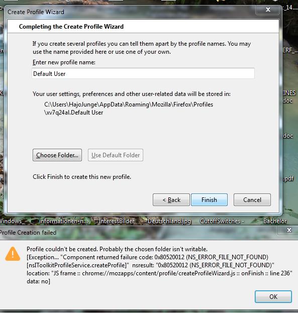 [Exception... "Component returned failure code: 0x80520012 (NS_ERROR_FILE_NOT_FOUND) [nsIToolkitProfileService.createProfile]" nsresult: "0x80520012 (NS_ERROR_FILE_NOT_FOUND)" location: "JS frame :: chrome://mozapps/content/profile/createProfileWizard.js :: onFinish :: line 236" data: no]