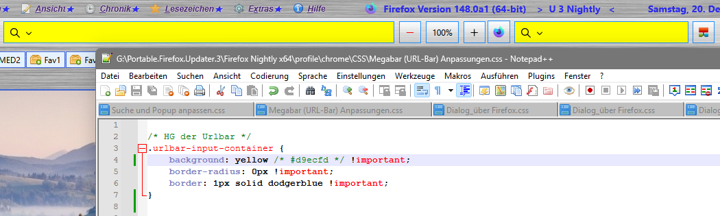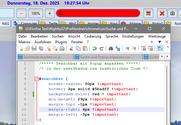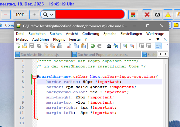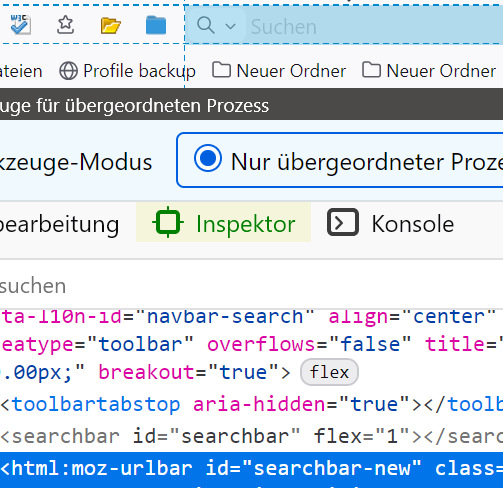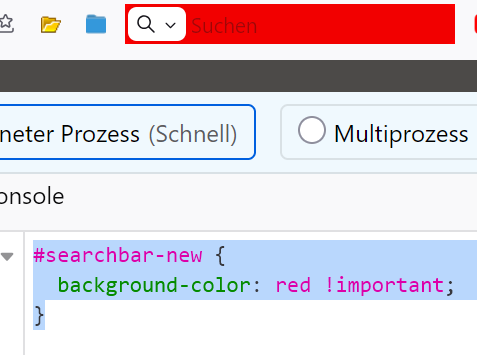 Dann hast du, so wie ich bisher auch, einen css-Code für die Urlbar, der eine Hintergrundfarbe dafür festlegt. Nach dem Update wird das auch auf die Searchbar übertragen (siehe Grafik). Nun besteht nur noch die Möglichkeit beides einzeln anzusprechen.