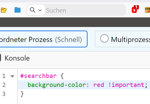 • Das funktioniert so eben nicht mehr seit der heutigen Nightly-Version, weil heute die neu implementierte Suchleiste aktiviert worden ist, die eine andere ID (#searchbar-new) hat.