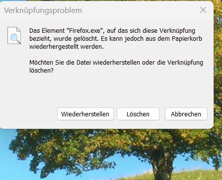 Dieser vermeintlich kausale Zusammenhang kann so nicht stimmen. Es mag ja sein, dass aus welchen Gründen auch immer die Verknüpfung kaputt ist. Aber dass es sich um eine exe-Datei handelt, kann nicht die Begründung sein, wieso Firefox nicht funktioniert. Wie gesagt ist genau das ja normal. Zeige bitte die Meldung im originalen Wortlaut, am besten per Screenshot.