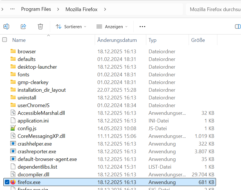 dass auf dem Desktop eine .exe-Datei liegt, ist normal. Diese Datei ist nicht zu verwechseln mit der .exe-Datei aus dem Installationsverzeichnis. Siehe Neuerungen von Firefox 145: