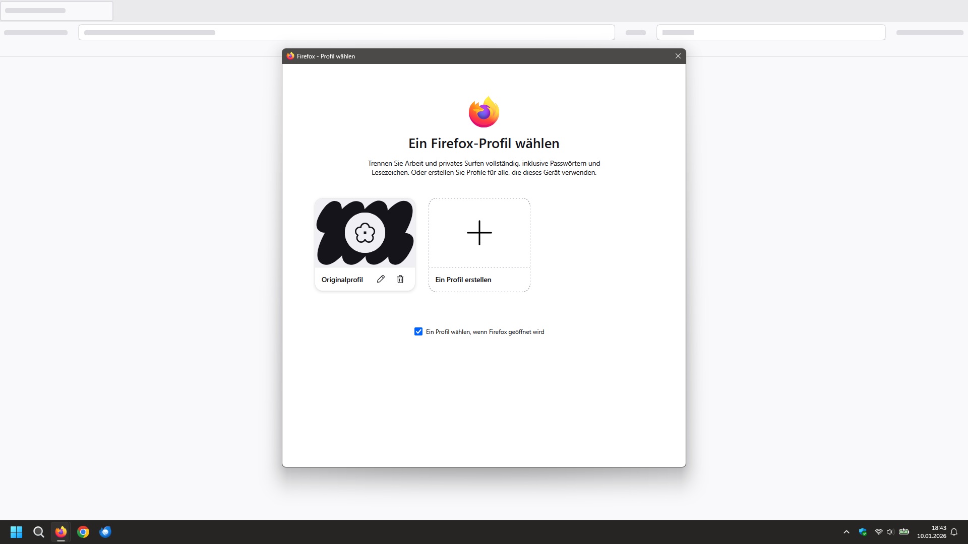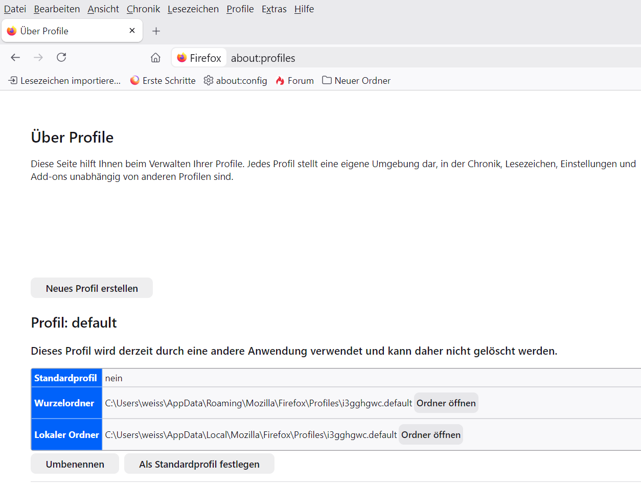 beim Programmstart habe ich jedes Mal ein deutliches Flackern am oberen Bildschirmrand. Dies wird offenbar durch die Profilverwaltung verursacht. Wenn ich mir das Auswahlfenster der Profilverwaltung beim Start anzeigen lasse, tritt das Flackern nicht auf. Ebenso tritt es nicht auf, wenn ich für ein bestimmtes Firefox-Profil eine Verknüpfung auf dem Desktop erstelle und direkt in dieses Profil starte.