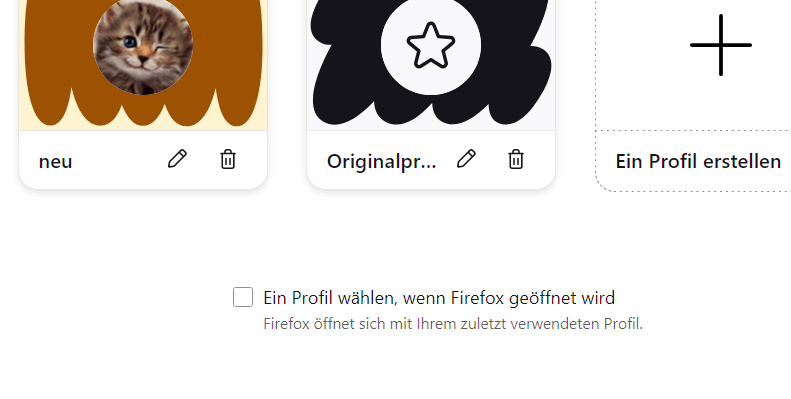Das Auswahlfenster der Profilverwaltung will ich mir nicht jedes Mal anzeigen lassen. Das mit dem Direktlink ins Profil funktioniert so lange ich Firefox manuell starte. Wenn ich aber z.B. in meinem Email-Programm einen Link aufrufe und Firefox noch nicht offen habe, wüsste ich nicht, wie ich das Flackern umgehen sollte. Ich kann die Desktopverknüpfung ja nicht als Standard-App auswählen, sondern nur Firefox an sich oder einen anderen Browser (was ich auch nicht will).
