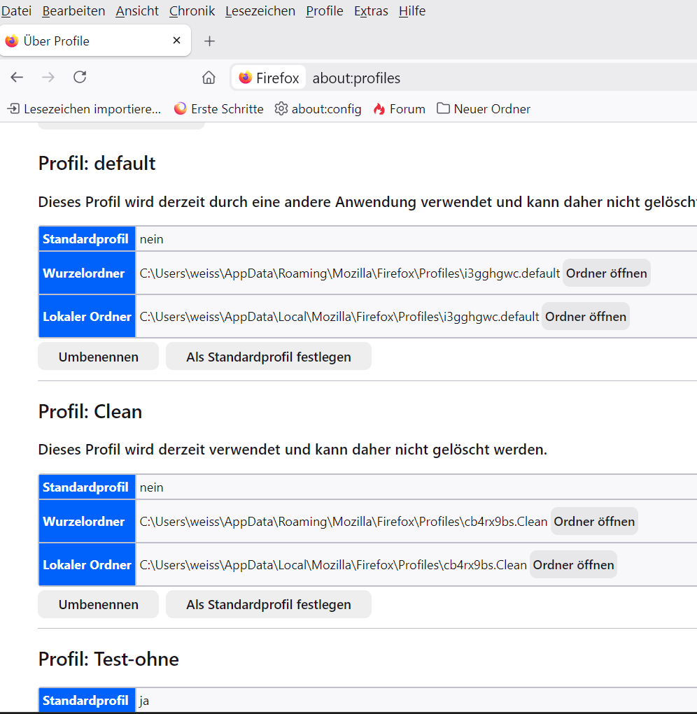 Danke ! na ja, ich habe offensichtlich ein 2. profil. Aber vielleicht ist es auch besser es als 2. profil zu definieren. gelesen, da gibt´s about:profil. so kann man wohl mehrere profile verwenden.