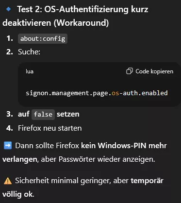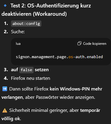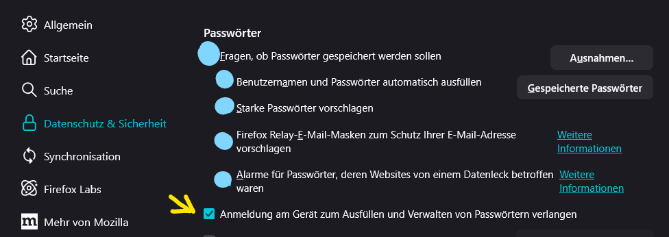 ich kann auf dem PC-Firefox meine Webseiten-Passwörter im "Manager" seit etwa 1 Woche weder anzeigen, noch kopieren, nur löschen. Die "Anmeldung am Gerät zum Ausfüllen und Verwalten von Passwörtern verlangen" ist angewählt, aber nicht mehr abwählbar.