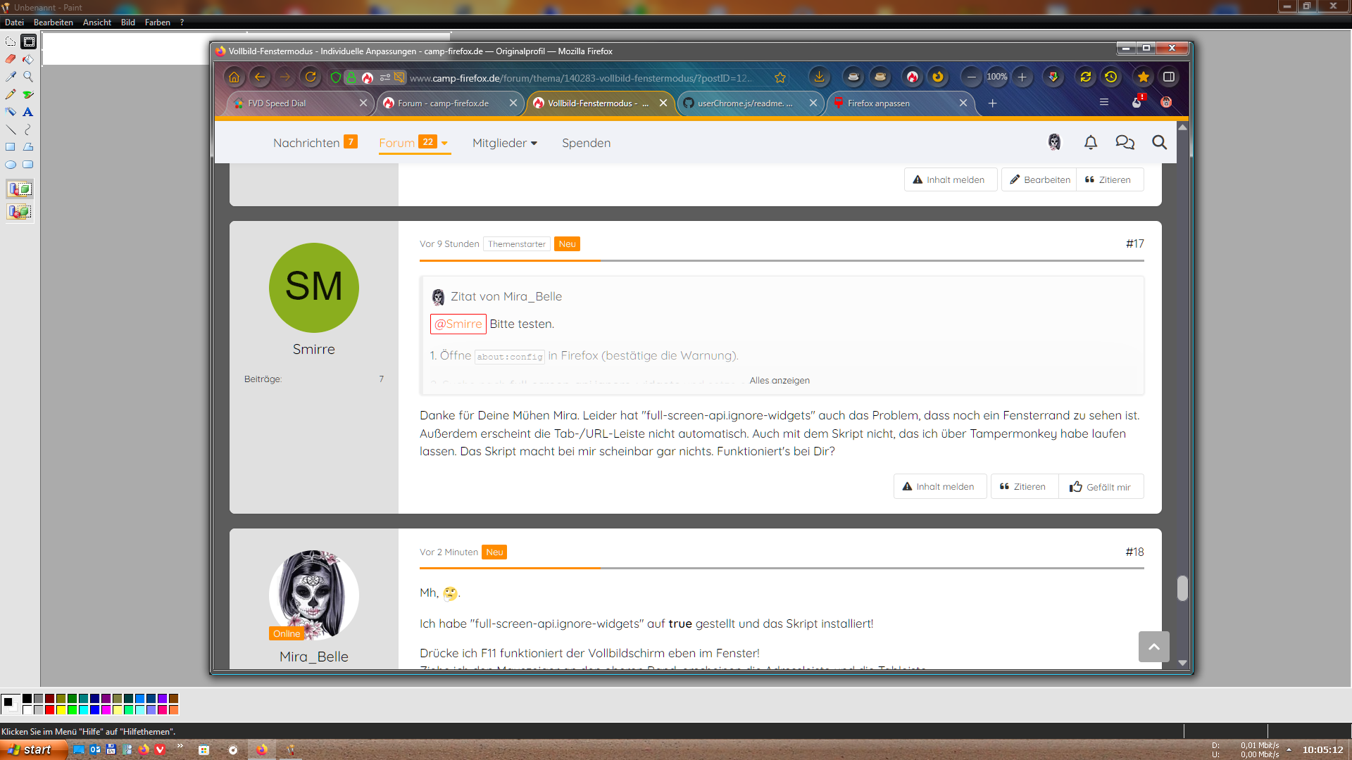 • Danke für Deine Mühen Mira. Leider hat "full-screen-api.ignore-widgets" auch das Problem, dass noch ein Fensterrand zu sehen ist. Außerdem erscheint die Tab-/URL-Leiste nicht automatisch. Auch mit dem Skript nicht, das ich über Tampermonkey habe laufen lassen. Das Skript macht bei mir scheinbar gar nichts. Funktioniert's bei Dir?