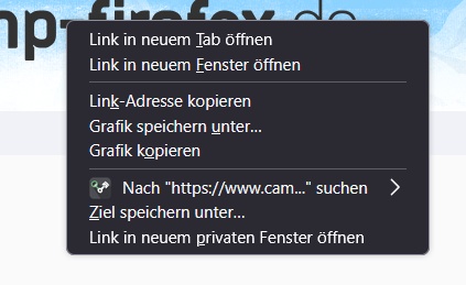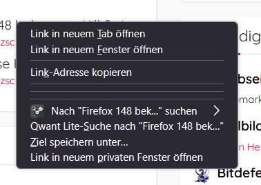 Seit einem der letzten Updates gibt es mal wieder ein paar unschöne Nebeneffekte. U.a. sieht das Kontextmenü bei Links in Firefox 146.x so aus: