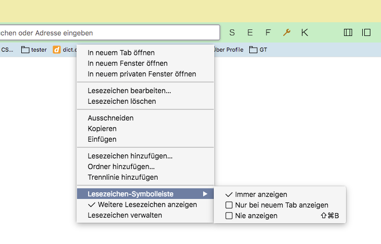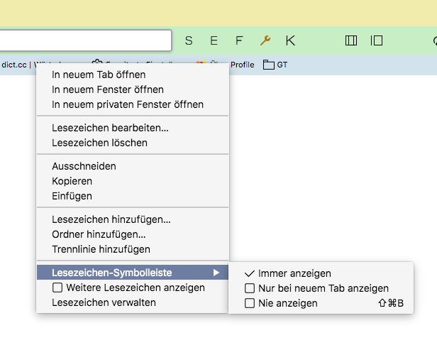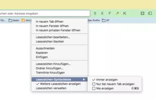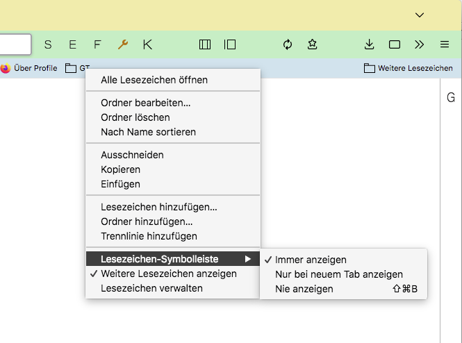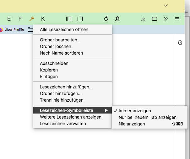 Ich lehn mich mal etwas aus dem Fenster, weil ich nicht extra die Testmaschine mit aktuellem OS und Fx anfeuern will, aber die letzten Jahre sah das am Mac so aus; Weitere Leseseichen anzeigen ist eine Checkbox, im Submenü mit Immer anzeigen etc. sind alle Einträge Radios.