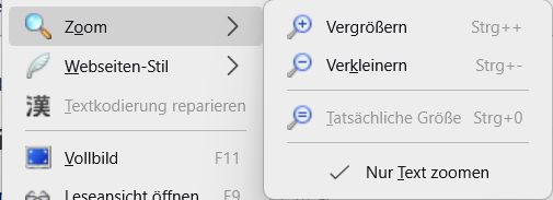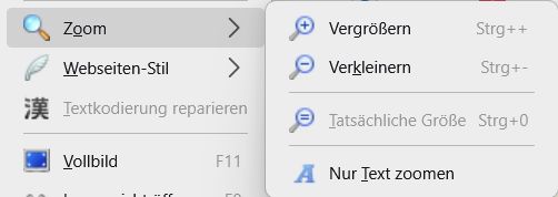 Das hat bisher gut funktioniert. Seit Firefox 149 gibt es jedoch Probleme mit den Haken und dem Text bei Auswahl einer Checkbox. Bei den meisten habe ich eine Lösung gefunden, bei einem aber nicht. Wenn ich in Ansicht > Zoom die Option Nur Text zoomen wähle, sind Haken und Text nach rechts eingerückt. Das bekomme ich nicht nach links. Ich habe hier wie z.B. auch im Menü Sidebar ein Wechselicon eingerichtet, wie in den angehängten Bildern ersichtlich. Der Code in meiner FF_Menu-Icons.css für das Zoom-Menü ist folgender: