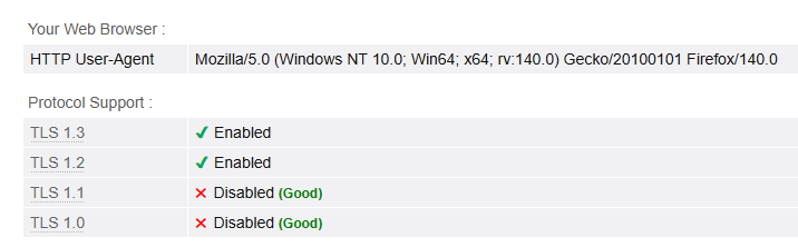 * erwägen Cipher Suites zu deaktivieren, die nicht einmal TLS 1.2 unterstützen und Chiper Suiten die zwar wenigstens TLS 1.2 unterstützen, jedoch kein PFS (Perfekt Forward Security). Hierzu z.B. auf der folgenden Seite vor dem deaktivieren irgend welcher Cipher Suiten anzeigen lassen, welche der Cipher suiten dort als Recommend angezeigt werden und dann erwägen alle anderen Cipher Suiten per policies.json zu deaktivieren: