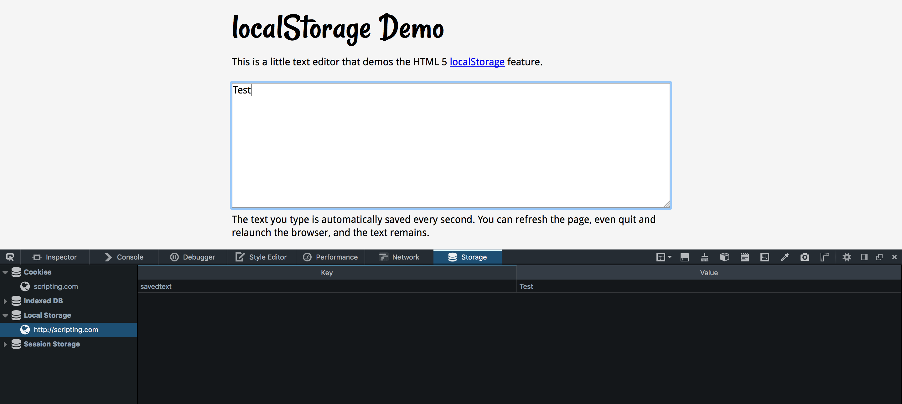 1. Ich öffne die Seite http://scripting.com/misc/localStorageDemo.html