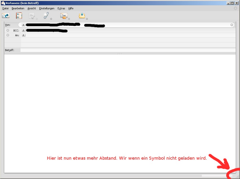 Mir gefällt es sehr sehr gut, danke.Heute ist mir in TB im Fenster in dem man Nachrichten verfasst ein fehlendes Symbol aufgefallen. Es handelt sich um das Symbol rechts unten in der Ecke welches angezeigt wird, wenn eine E-Mail mit S/MIME signiert wird. Wenn ich mich recht erinnere war es in einer der früheren Versionen vorhanden.