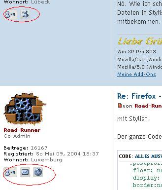 Alles anzeigen@namespace url(http://www.w3.org/1999/xhtml); @-moz-document url-prefix("http://www.camp-firefox.de/forum/viewtopic.php") { .postbody { float:right !important; width: 80% !important; border-left: 1px solid #e0e0e0 !important; padding-left:10px !important; } .postprofile { float: none !important; display: block !important; border:none !important} .edit-icon{ float: right !important; } .online { background-position:140px 10px !important; background-image: url("file:///d:/3 - mozilla/icon_user_online2.gif")!important; } .post.bg2 { background-color: #CADCEB !important; } .post.bg1 { background-color: #FFFFFF !important; } } #ECF3F7Nun stimmt allerdings die Hintergrundfarbe von einigen Icons nicht mehr (siehe Bild) - könnt Ihr mir da sagen, wie ich das hinbekomme?