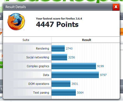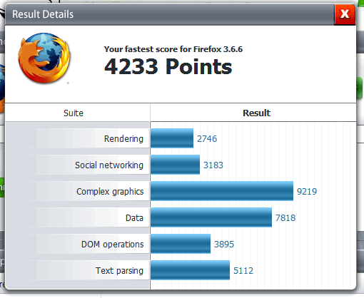 Ich hatte mit dem 3.6.4b2 (oder so) im Peacekeeper Data-Test mal 9795 und bin mit dem 3.6.6 bei 7890. Der aktuelle Build vom 3.6.7 brachte es hier auf 5340. Also das ist schon relativ grausam abgekackt.XPsp3, E8400 @3.9 Ghz, 3GB.