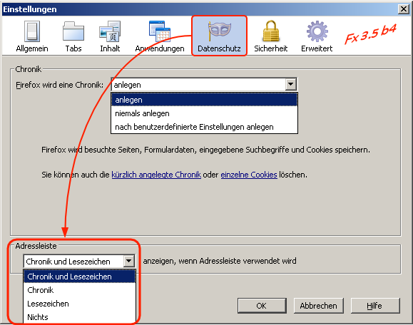 Ich habe Firefox 3.0.0.10 und möchte, sobald ich in der Adresszeile etwas eingebe, nur meine Lesezeichen durchsuchen lassen und nicht die Chronik. Früher habe ich meine Chronik nicht speichern lassen, deshalb habe ich z.B. wenn ich Ebay in die Adresszeile eingeben habe, nur die Lesezeichenlinks oben anzeigen lassen und nicht die ganzen Ebayseiten auf denen ich schon einmal war. Dies möchte ich nun gerne deaktivieren, weil ich nun auch meine Chronik speichern lasse.